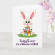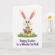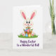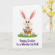 This card shows a rounded, stylized bunny sitting front and center, its creamy white fur warmed by pink inside the tall ears and on the paw pads 🐰. The bunny’s big shiny eyes and rosy cheeks give it a gentle, friendly look, like it’s pausing to share a quiet moment with someone close. It rests on a small patch of bright green grass against a plain white background, keeping the scene simple and airy. In its arms, the bunny cuddles a woven basket filled with spring flowers in pink, purple, and blue, with little sprigs of green leaves peeking out 🌷. Near the basket, two decorated oval eggs sit together, one with yellow stripes and the other in blue, adding a sweet, familiar holiday touch. Below the illustration, the phrase “Happy Easter to a Wonderful Kid!” is centered in rich purple text near the bottom edge. Soft shading and smooth outlines give the bunny and flowers a tender, cozy look, as if the basket is being held with extra care. The grass forms a small rounded mound under the bunny, with short blades textured in layered green tones.