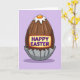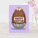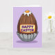 This design shows a large chocolate-brown egg-shaped treat sitting snugly in a crinkled silver foil wrapper against a soft lavender background. Fine vertical ridges on the chocolate add texture, and the gentle lighting gives it a smooth, inviting glow. From the top, a glossy stream of white icing drips down as if leaning in for a sweet embrace, wrapping around a bright orange round accent that resembles an egg yolk. That little “yolk” detail adds a friendly wink to the scene, like an inside joke shared between close friends 🐰. On the front, a rectangular yellow label with a warm red border sits centered and draws the eye. The words “HAPPY EASTER” are placed prominently on the label in purple, flowing lettering, standing out clearly against the yellow. The wrapper’s folds fan outward at the bottom with soft highlights and shadows, and a small 🌷 touch comes through in the springlike lavender backdrop.