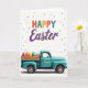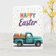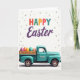 This card features a retro pickup truck parked across the lower portion, painted a cool turquoise with smooth highlights that make it look freshly polished. In the open wooden bed sit five decorated eggs, arranged close together like friends leaning in for a photo 🐰. Each egg has its own look: a soft lavender one with tiny floral dots, a bright orange one with small hearts, a sunny yellow one, an aqua one with white speckles, and a warm terracotta one with lighter flecks. Near the top, the text “HAPPY” appears in large uppercase letters, with each letter in a different bright color such as red, teal, and yellow. Just beneath it, “Easter” is written in deep purple, in flowing cursive-style lettering, creating a gentle contrast with the sharper letters above. The white background is sprinkled with short, uneven gray dashes that drift around like confetti, adding a light, friendly energy 🌷. The turquoise truck sits under the words with the eggs lined up neatly inside the slatted bed.
