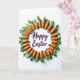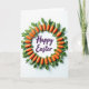 This card features a top-down arrangement on a bright white background, where small orange root vegetables with leafy green tops form a neat circular wreath. Larger, wide green leaves sit beneath the ring, adding layers and a gentle, garden-fresh setting. The careful spacing makes the circle feel like it’s holding a quiet moment together, like friends linked arm in arm around a shared table 🌷. In the open white center, the words “Happy Easter” sit prominently in deep plum-purple lettering, centered and easy to read. The smooth, slightly ridged surfaces of the vegetables catch soft, even light, giving them a fresh-picked look. Greens range from light, springy tones to deeper shades, creating depth that feels cozy and close, like a warm glance exchanged across the wreath 🐰. The text is framed by the orange ring, with the leafy tops pointing inward and outward against the white space.