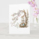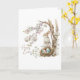 An Easter greeting card featuring a watercolor illustration of a bunny guarding a nest of colorful pastel Easter eggs below a flowering Spring tree blooming in pink and white watercolor flowers. The wording "Happy Easter" is positioned to the lower left of card in a color to match illustrations. The inside of card left blank for a personal greetings and a small brown bunny added to the back of card for a whimsical touch.