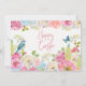 Easter greeting note card featuring an abundance of watercolor spring and summer florals on the front - blue hydrangeas, pink and peach roses and pink peonies to name a few with a small blue finch and blue butterfly resting on flowers for additional charm. Script "Happy Easter" on front in font color to match florals. Inside top displays a repeat of floral border with room for a personal note or signature.