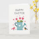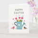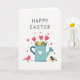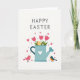 Designed with a soft spring look, the scene centers on a light blue watering can with a white heart on its side and a heart-shaped spout that suggests caring between friends. Three bright pink tulips rise from the opening like a small bouquet 🌷, and a smooth golden egg sits nestled among the stems. On the left, a round pink bird with an orange beak faces inward as if watching over the flowers with gentle attention. On the right, a plump blue bird with an orange belly mirrors the pose, creating a sweet, companionable balance between the two. Tiny pink hearts float across the white background, adding a quiet romantic touch without crowding the artwork 🐰. The words “HAPPY EASTER” sit at the top in uppercase, plain lettering in a dark tone that stands out clearly against the pale space. The palette stays mostly pastel—light blue, pink, soft gold, and a few warm orange accents—framed by plenty of white space and scattered heart shapes.
