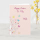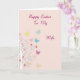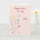 This design shows a soft blush-pink background that sets a cozy spring scene with a romantic tone. In the upper-right, the message “Happy Easter To My Wife” appears in magenta lettering, placed with plenty of open space around it so it feels intimate and direct. From the lower-left corner, a stylized white tree stretches upward, its bare branches reaching as if leaning in close. Small blossoms dot the branches in pink, red, and yellow, like little notes of affection tucked into the scene 🌷. Across the card, butterflies in yellow, mint green, soft pink, blue, and deep magenta drift in a gentle scatter, suggesting a light, shared moment between two people 🐇. Soft shadows under the tree, blossoms, and butterflies give the elements a subtle cutout look with a touch of depth. The butterflies appear at different heights, with a deep magenta one near the upper area and a bright blue one closer to the center-right.