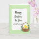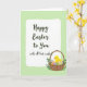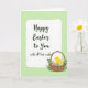 This card features a pale green background that feels like early spring, with a softly outlined white panel centered on top. Across the upper and middle area of the white panel, dark green lettering in a flowing style reads, “Happy Easter to You with all best wishes!” The message sits with generous spacing, leaving room for the artwork to breathe and keeping the layout easy to take in. In the lower right of the panel, a woven basket with warm brown tones and a curved handle leans slightly as if set down with care. The basket is filled with pastel eggs in lavender, mint, and coral, each decorated with small patterns that add a gentle, friendly touch 🐰. Tucked among leafy green sprigs and tiny blossoms, a small yellow chick with a neat orange beak peeks out, giving the scene a sweet, companionable feel 🌷. The white panel has rounded corners and a faint outline, and the basket sits just inside the lower right edge.