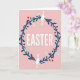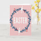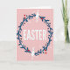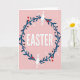 This design shows a soft pastel pink background with the word “EASTER” set in large white letters right at the center. A deep blue wreath of slender branches circles the text, dotted with small white blossoms and a few tiny dark bell-shaped accents. Bright red hearts are tucked among the branches, adding little flashes of affection like a quiet note passed between friends. Two small white rabbits 🐰🐇 sit on the wreath, one upside down at the top with a tiny red nose and the other resting at the bottom as if watching it with gentle amusement. Their simple faces and close placement make the scene feel like a shared joke or a tender moment without needing extra details. A few scattered white dots float around the wreath, giving the layout a light, airy look. The central word stays crisp and white while the blue wreath and red hearts frame it in a neat circle against the pink field.
