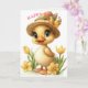 Adorable cartoon style little girl Duckie has a cute smile and big happy eyes. She is wearing a pretty straw hat and she is sitting in a garden of Spring Daffodils.