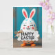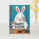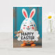 This card shows a close-up of an egg-shaped bunny figure centered against a softly blurred blue background 🐰. The figure is bright white with scattered blue and rosy pink dots, and it has closed smiling eyes, pink cheeks, a tiny red nose, and two front teeth that add a sweet, friendly look. Small orange feet sit on a lightly textured wooden surface, giving the scene a cozy, down-to-earth setting. The bunny holds a white cloud-shaped sign close to its chest, as if offering it to someone special with a gentle, affectionate gesture 🌷. The main message is placed in the middle of the sign in dark lettering that stands out clearly against the white. A simple twine bow is tied at the upper left corner of the sign, adding a natural touch beside the smooth figure. Soft, even lighting brings out the rounded contours, the dotted colors, and the twine bow against the blue backdrop and warm wood below.