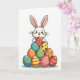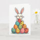 Designed with a long-eared bunny peeking from behind a stacked pyramid of decorated eggs, this card keeps the scene bright and friendly 🐰. The bunny’s tall ears are lined in soft pink, and its wide eyes and rosy cheeks give it a tender, welcoming look, like it’s sharing a quiet moment with someone just out of view. Below, egg-shaped forms are arranged in neat tiers, each one painted in sunny yellow, calm blue, leafy green, warm orange, and gentle pink. Simple patterns like dots, stripes, and wavy lines add variety while still feeling coordinated. The background stays plain white, making the colors stand out sharply and keeping the focus on the bunny and the eggs. Any greeting text can sit centered near the top in a light pastel shade, with a smaller line placed beneath it in a slightly darker tone for contrast 🌷. Crisp outlines define the bunny’s smile and the edges of each egg, and the pink inner ears echo the softer pink eggs in the stack. The eggs form a tidy triangle at the bottom, with the bunny’s head and ears rising just above the top tier.