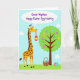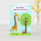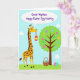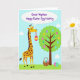 The front design shows a tall, spotted giraffe standing on the left, its warm yellow coat dotted with deep brown circles, wearing a calm expression as it holds a decorated red-and-yellow egg by a thin ribbon. On the right, a rounded tree with a bright green canopy becomes an “egg tree,” with many patterned eggs hanging like ornaments in lavender, sky blue, teal, and sunny orange 🌷. The giraffe’s gentle posture and the careful way it lifts the egg suggest a sweet, caring bond, like it’s sharing a small surprise with someone close. Below the tree, a woven basket is filled with more decorated eggs, with a few resting on the lime-green grass as if a hunt has just begun 🐰. The background stays simple with a light blue sky and soft white clouds that keep the scene airy and calm. Near the top, a white speech-bubble shape floats above the giraffe, and the message “Great Nephew Happy Easter Egg Hunting” appears inside in bold purple lettering. The speech bubble sits slightly left of center, pointing toward the giraffe’s head, while the multicolored eggs hang at different heights across the right side of the tree.