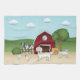 Destei's original cartoon illustration of a cute English cream coat color Golden Retriever breed dog at a farm. There is a red barn behind the dog with some hay on the side of the entrance. There are also two chickens nearby the dog, a black and white cow behind a fence and a cute sheep by a tree. The background features green grassy hills and a blue sky with clouds.