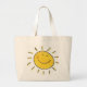 Drawing of a sun with a happy face on a natural colored canvas bag; the black handles on the bag compliment the black border around the image