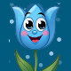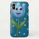 A vibrant phone case featuring a cheerful blue flower character with a smiling face. The flower has large expressive eyes and rosy cheeks, set against a deep tealbackground. Surrounding the flower are playful, scattered white polka dots.