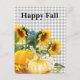 This fall season postcard features pumpkin and sunflowers on a brown gingham background.