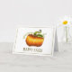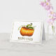 Classic card perfect for sending fall greetings! Card features a squat, bright orange pumpkin with curly green stem and leaves. "Happy Fall" message is inscribed in golden tones beneath; a delicate golden border frames the design.