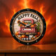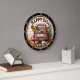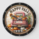 This round wall clock features a charming autumn scene with a vintage pink pickup truck overflowing with pumpkins and a sunflower. It's parked on a rustic wooden planks background, surrounded by more pumpkins, corn stalks, and a black and white plaid blanket. "HAPPY FALL" is prominently displayed, framed by a rope-like border.