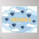 Happy Father's Day yellow text, blue flying hearts , white clouds in the sky, Father's day party supplies
