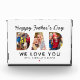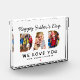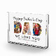 Create a stylish and memorable gift for Dad this Father's Day! This custom tabletop photo block features a collage of three favorite family pictures of the kids designed as a modern and bold sans serif typography design. Personalize the custom text with the names of the children and modify the black text, red heart, and white background if you would like different colors to coordinate with your home decor.