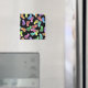 Illustration of lots of colourful footprints with happy smiling faces stomping around against a black background. Image available on various gifts and products.