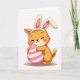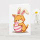 Designed with a sweet spring look, this card features an orange, cat-like character standing front and center on a bright white background, wearing a headband with tall cream bunny ears tinted pink inside 🐰. Its eyes are closed in a calm, affectionate grin, and a soft blush on the cheeks suggests a cozy, friendly mood. The small curved paws hug a large oval egg close to its chest, as if sharing a private little secret with someone nearby. The egg is decorated with wide stripes in light pink and creamy white, adding a gentle festive touch 🌷. A few short green blades of grass sit beneath the egg and feet, giving just enough grounding without crowding the scene. Near the top, the greeting text sits in a simple, rounded style in soft pink, leaving lots of open space around the character. The bunny ears rise above the headband in pale cream, with a subtle rosy inner glow and crisp edges against the white.