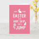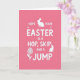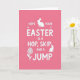 This design shows a bright fuchsia background that sets a lively spring scene, with a friendly mood that feels like a note shared between close friends. Centered on the front, a multi-line greeting appears in rounded white sans‑serif letters, stacked neatly so the main word sits in the middle. Two long‑eared bunny silhouettes 🐇 add a gentle, affectionate touch—one near the top looks alert as if pausing mid‑hop, while the other at the lower right sits calmly, as though keeping quiet company. Small star-like marks dot around the central word, like tiny sparkles that draw your eye without crowding the layout. In the lower left, a simple flower emblem 🌷 with radiating petals balances the bunnies and keeps the composition from feeling too top‑heavy. The strong contrast between the pink field and the white lettering makes the message easy to read, while the soft curves in the shapes suggest a tender, easygoing connection. A stylized flower with rounded petals sits at the lower left, and the seated bunny rests at the lower right against the fuchsia backdrop.