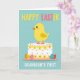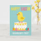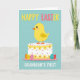 Designed with a fluffy yellow chick perched proudly on top of a white-frosted cake, the illustration feels sweet and friendly, with the little bird’s orange beak and soft pink cheeks turned as if posing for someone close by. A cool teal background sets the scene and makes the warm yellows and gentle pastels stand out like early spring 🌷. Around the cake is a ring of small yellow flowers with red centers, arranged like a cheerful garland. Scattered red dots decorate the frosting, adding a confetti-like look without crowding the design. Near the bottom, several decorated eggs in orange, pink, and aqua show stripes, zigzags, and solid sections, sitting close together like they were placed with care 🐰. Any greeting text appears above the cake, centered in a simple, easy-to-read style, with a light color that contrasts against the teal. The cake plate and lower edge are kept minimal, letting the patterned eggs and flower band draw the eye.