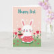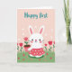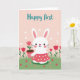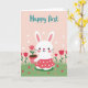 This card shows a white bunny standing front and center, with soft pink inside its ears, rosy cheeks, and a tiny heart-shaped nose that gives it a sweet, friendly look 🐰. Its black eyes and fine whiskers are drawn simply, and the bunny wears a coral-pink skirt with small white polka dots that adds a flirty, cheerful touch. In its paws, it offers a small flowerpot with a red tulip, and the gentle tilt of its head makes the gesture feel like a shy gift between close friends. A green garden stretches along the bottom, sprinkled with tiny star-shaped blossoms in pinks and reds like confetti on the grass. Taller red tulips rise on slim green stems around the bunny, creating a loose frame that draws your eye back to the little offering. Near the top, the words “Happy first,” appear in teal cursive lettering, centered against a blush-pink sky. The sky is dotted with small white flower-like asterisks, and a few red tulips peek up along the sides 🌷.