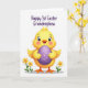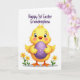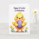 This card shows a fluffy yellow baby bird centered on a bright white background, cuddling a long purple egg as if it’s a treasured gift between close family or friends 🌷. The bird has round, soft features, big dark shiny eyes with tiny lashes, a light blush on its cheeks, and an orange beak curved in a cheerful smile. Its wings wrap around the egg in a gentle hug, giving the scene a caring, affectionate look. The egg is decorated with small white dots and a faint crisscross pattern that adds extra detail without crowding the picture. Along the bottom, small white-and-yellow flowers with green stems are scattered like a spring border, and the lighting stays soft so the bird looks plush and the egg looks smooth 🐰. Near the top, the message “Happy 1st Easter Grandnephew” appears in purple, in a loose handwritten-style font, spaced clearly above the character. The purple lettering sits above the bird’s head, while the flowers cluster near the lower edge beneath the egg.