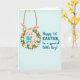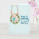 This card shows a cute, humanlike bunny 🐰 sitting inside a round swing made from a deep green leafy wreath dotted with white daisies and small yellow flowers. Two thick, braided ropes hold the wreath swing in place against a light aqua background with a faint, cloudy texture that adds gentle depth. The bunny is drawn in soft pink tones with rosy cheeks, bright eyes, and an open smile that feels like it’s meant for someone close. It wears a blue-and-white striped top with a small yellow flower on the chest, tying it to the blossoms around the wreath. Its little feet with pink pads hang down in a relaxed way, giving the scene an easy, affectionate energy, like a friendly hello or a sweet cuddle. On the right side, the message “Happy 1st EASTER, to a special little boy!” is written in flowing blue lettering, arranged in a neat stack that balances the illustration 🌷. The wreath’s flowers have sunny yellow centers, and the bunny sits snugly in the middle of the green ring.