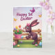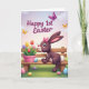 This card shows a spring scene with a long-eared bunny sitting on a pale wooden bench, wearing a pink bow and a small red nose, gazing tenderly at a nearby pot of tulips 🌷. The tulips rise from a pink planter and mix yellow, orange, soft pink, and lavender blooms, like a little gift placed close for someone special 🐰. Behind them, the sky blends soft lavender and pink tones with thin white clouds drifting across, giving the moment a gentle, early-morning glow. Three winged insects flutter overhead—one in deep purple and two in warm amber—adding light movement above the quiet bench. Below, bright green grass stretches across the bottom, and pastel egg shapes with delicate patterns are scattered on the ground and tucked near the bench, hinting at a shared holiday search. The words “Happy 1st Easter” appear prominently across the upper area in a deep berry color, standing out against the pale sky. The bunny’s wide eyes and slightly tilted posture make it feel like it’s admiring the flowers the way a close friend might admire a thoughtful surprise. Nearby, the patterned eggs show soft stripes and tiny dots in pale pinks, yellows, and purples.