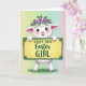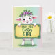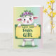 This design shows a young sheep character centered in the scene, with soft, cloudlike shading and big shining eyes that seem to gaze out with gentle affection. Its small pink nose and lightly rosy cheeks add a tender, friendly look, like it’s posing for someone special. A ring of fresh green leaves with tiny purple flowers rests on its head, bringing a spring garden feel 🌷. The sheep holds a rectangular sign close to its chest, as if offering it to a loved one with quiet pride. The sign has a deep green border with little leaf details in the corners, and a pale yellow middle panel. Across the yellow area, the message “HAPPY FIRST Easter GIRL” sits centered in dark green lettering, with “Easter” slightly larger than the other words 🐰. Behind everything, the background fades from soft green and yellow on the left into blush pink and pale blue on the right, with a narrow strip of stylized green grass along the bottom.