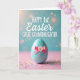 This card shows a large pastel blue egg sitting in the lower third, its smooth surface dotted with tiny multicolor confetti spots that add a light party feel 🌷. A bright pink ribbon wraps around the middle and ties into a tidy bow, topped with a single daisy-like flower with a sunny yellow center, like a small gift offered with affection. The background shifts from a calm blue-green at the top into a soft baby-pink area near the bottom, creating a gentle spring setting where a close bond can be imagined. Warm, blurry light circles glow across the upper area, like distant fairy lights watching over the scene. Small confetti pieces are scattered across the pink foreground, echoing the dots on the egg and keeping the celebration going 🐰. Across the upper portion, white flowing lettering reads “Happy 1st Easter Great Granddaughter,” centered and easy to spot against the cooler tones. The egg’s pink bow and little flower sit slightly right of center, with confetti sprinkled around them on the pink lower edge.