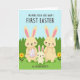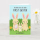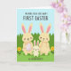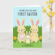 This card shows three rounded bunny figures 🐰 standing close together in a soft spring scene, arranged like a gentle triangle that suggests closeness and care. Two taller, cream-colored bunnies flank a smaller one, and their tiny dot eyes and faint pink cheek blush give them a tender, affectionate look. Long ears with pink inner details tilt slightly inward, as if they’re sharing a quiet, friendly moment. Behind them, a pale sky-blue background meets a bright green ground, keeping the setting light and seasonal with a few simple yellow flowers 🌷 scattered near their feet. One of the taller bunnies holds a large oval egg decorated with polka dots in purple, orange, and light blue, adding a festive focal point. The main message sits above the illustration in a dark, easy-to-read cursive-style font, reading “WISHING YOU A VERY HAPPY FIRST EASTER.” A second line of text appears below the characters in the same color and style, reading “AS GRANDPARENTS,” centered under the green foreground. The egg’s dotted pattern stands out against the cream fur, with the purple, orange, and light blue circles spaced evenly across the oval.