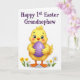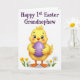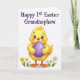 At the center of the card is a fluffy baby bird with bright yellow feathers, round blue eyes, and a soft blush on its cheeks, holding a smooth lavender egg close as if it’s a treasured gift between friends. The background stays white and open, letting the gentle shading and crisp outlines give the bird a lightly three-dimensional look. A small cluster of spring flowers sits near the bottom, with yellow-and-white daisy heads and green stems that ground the scene like a tiny garden patch 🌷. Across the top, the message “Happy 1st Easter Grandnephew” is written in flowing purple lettering, arcing neatly above the bird’s head. The bird’s wide-eyed gaze and careful grip on the egg add a tender, affectionate mood without needing extra decoration 🐰. The colors stay mostly sunny yellow, lavender, fresh green, and purple, keeping the layout simple and easy to read. The lavender egg shows faint horizontal bands, and the daisies are spaced in a light scatter beneath the bird.