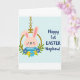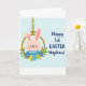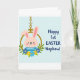 Designed with a soft, pastel rabbit at the center 🐰, this illustration shows a sweet face with rosy cheeks, dot eyes, and tall ears, giving it a gentle, affectionate look. The rabbit’s head sits inside a golden circular hoop that hangs from a decorative golden chain, like a small keepsake frame. Below the hoop, a garland of stylized leaves and flowers spreads outward in deep blue, light blue, sunny yellow, and fresh green, adding a friendly, celebratory touch 🌷. The rabbit wears a blue-and-white striped top, and the neat stripes add a cozy, youthful feel. The background is light blue with a faint grid texture that keeps the scene calm and airy. On the right side, the greeting “Happy 1st EASTER Nephew!” appears in large, rounded lettering, set in a dark tone that stands out clearly against the pale background. The words are stacked to the right of the framed rabbit, with “Happy 1st” above “EASTER” and “Nephew!” below, next to the hanging hoop and floral garland.