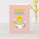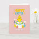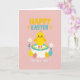 This design shows a cute, stylized little bird in sunny yellow with rosy cheeks, perched atop a frosted cake as if posing for a sweet photo with someone it adores. The cake sits centered on a muted rose-pink background, trimmed with a soft blue scalloped edge and dotted with tiny yellow blossoms that feel like early spring 🌷. Two slim yellow candles rise from the top, their small flames leaning slightly, adding a gentle sense of closeness and celebration. Around the cake, decorative egg shapes in yellow, coral, and teal fill the space with friendly patterns, like they were arranged by caring hands for a shared moment 🐰. Simple white daisies with thin green stems are scattered nearby, balancing the scene with a fresh garden touch. At the top, a seasonal greeting appears in rounded letters, alternating sunshine yellow and sky blue, while a short line of white text sits below the cake near the bottom edge. The bird’s bright body contrasts against the pink backdrop, and the blue trim frames the cake like a neat ribbon around the centerpiece.