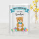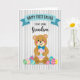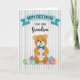 This card shows a friendly, bear-like character in warm light-brown tones sitting at the center with a gentle smile, rosy cheeks, and a neat blue bow tie, as if posing for a sweet keepsake 🐰. It cradles an oversized striped oval in soft pastels—pink, blue, purple, and yellow—held close like a thoughtful gift for someone dear. Around its feet, several smaller decorated ovals are scattered, each with stripes, dots, and simple abstract marks that feel like little notes of affection. The character’s relaxed posture and tender gaze toward the big oval give the scene a cozy, close-knit feel, like a quiet moment shared between family or friends. Near the top, a wide cyan-blue ribbon banner stretches across with the words “HAPPY FIRST EASTER” in clear, light lettering. Near the bottom, “TO MY LOVING Grandson,” appears in a flowing dark text line centered beneath the character, with the word “Grandson” standing out in a slightly larger style 🌷. Behind everything, the background is made of evenly spaced vertical gray-and-white stripes.