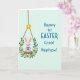 This card shows a spring scene split into two halves on a pale mint-green background, with a gentle, friendly mood 🌷. On the left, a light-pink long-eared bunny sits on a rustic wooden swing, its small face turned forward with a tender, welcoming look 🐰. The bunny wears a simple blue tunic, and the swing hangs from twisted brown ropes that feel cozy and familiar. Around the swing is a garland of blue and yellow flowers with green leaves, adding a fresh garden setting that suggests caring attention, like a gift arranged for someone close. On the right, the message “Happy 1st EASTER, Great Nephew!” is placed in large, friendly blue lettering, centered and easy to read. The text takes up most of the right side, leaving airy space around it so the words stand out against the mint background. A small yellow star-shaped flower sits at the top where the ropes meet, above the floral garland.