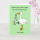 A simple illustration of a giant white stork holding a baby in a shamrock patterned sheet. The image is set against a pale green colored background and accompanied by the words 'Wishing you a very happy first St. Patrick's Day as a Mom'.