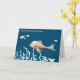 This is one of those card to treasure. The little fish in the front is just so happy that it's his or her birthday. This turquoise and orange fish contrast with the dark navy blue background. Some light turquoise corals and fishes are decorating the rest of the card. Personalize the text with your own message.