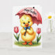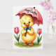 This card shows a plump golden-yellow baby bird centered on a white background, with big blue eyes, long lashes, and an open orange beak that looks like it’s smiling at you. A small blue bow tie sits neatly at its neck, giving it a sweet, friendly look, like it’s dressed up to meet someone special. The bird stands on a patch of spring-green grass between two pink tulips 🌷, arranged like they’re leaning in to keep it company. Above its head, it holds a pink parasol, and the bird’s upward gaze toward it feels tender and affectionate, like sharing a private little moment. Curved lettering appears on the parasol canopy in a darker pink tone, placed near the center so it reads clearly. Soft shading in the feathers adds a fluffy texture, with sunny yellow, gentle rose, and fresh green colors standing out crisply. Two blooming tulips frame the bird on either side, while the pink parasol sits overhead like a small shelter, with a tiny 🐰 touch in the springtime mood.