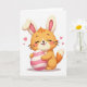 This card features a cute animal character that blends a young fox’s rounded muzzle with long rabbit ears, giving it a sweet, friendly look 🐰. Its eyes are closed in a gentle smile, with rosy cheeks and fine whiskers that suggest a shy, affectionate moment. In its small paws, it holds a large oval decoration with wide horizontal stripes in soft pink and creamy white, like a spring treat being hugged close. The background is bright white, keeping the focus on the character and the striped oval while adding an airy, open feel. A few small pink hearts float near its head, like a quiet exchange of fondness between the character and what it’s holding. The main text sits above the illustration in a light pink color, with a shorter line in matching pink placed below for balance 🌷. Soft shading beneath the character and the oval adds depth, and the lighting gives the stripes a smooth, slightly glossy look.
