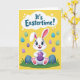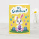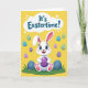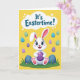 This card shows a cheerful white bunny centered on a sunny yellow background, smiling with rosy cheeks and bright blue eyes 🐰. Its long ears are tipped with soft pink, and its front paws, padded in pink, rest forward as it hugs a large purple egg with faint horizontal stripes. The bunny’s relaxed pose and open grin feel like it’s sharing a sweet moment with someone close, as if offering the egg like a friendly gift. Around it, smaller eggs float in the air in light blue, mint green, and deeper purple, many with delicate stripe details that add gentle motion. Near the top, a rounded cloud-shaped bubble holds a short Easter message in blue lettering, set clearly above the bunny’s ears. Along the bottom edge, a band of green grass anchors the scene, with a few larger dark blue eggs peeking up from the blades 🌷. The yellow field fills the background while the striped eggs scatter around the bunny like confetti in midair.