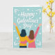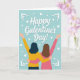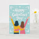 This greeting card shows two women seen from behind, hugging close against a soft teal background. One wears a bright yellow top and lifts her arm up like she’s cheering, while her friend in a pink outfit raises her arm too, as if they’re celebrating together. Across the upper half, the words “Happy Galentine’s Day!” appear in white, flowing cursive-style letters with a slight shadow that helps them stand out. Small white hearts are sprinkled around the scene, adding a gentle touch of affection ❤️. Curved decorative swirls sit near the top and bottom corners, framing the design without taking attention away from the hug. The simple shapes and strong color contrasts keep the focus on their closeness and shared happiness. It feels meaningful to give because it’s an easy way to say “I’m grateful for you” to a friend who shows up for you 🥰.