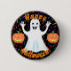 A cute cartoon ghost and pumpkins make up this fun Halloween button/pin. Customizable so you can add your own text and change the background color. Show off your Halloween spirit with this fun design!