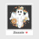 Contour sticker with an illustration of a smiling ghost. Decorated with flowers, rainbows and bats.