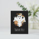 Thank You postcard with an illustration of a smiling ghost. Decorated with flowers, rainbows and bats.