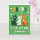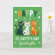 This card shows three cheerful cartoon cats standing close together on an emerald-green background sprinkled with small white shamrocks ☘️. At the top, the word “HAPPY” appears in large white letters, centered and easy to spot. Below the cats, “ST. CATTY’S DAY” is set in matching white text, with “Granddaughter” placed nearby in a flowing green style that feels like a gentle note tucked into the design 💚. The cats’ wide golden eyes and open smiles, plus the way they lean in toward each other, give the scene a sweet, friendly closeness. One cat is dark green with black polka dots, another is white with green spots, and the third is orange with deeper orange patches. Their upright poses and perked expressions make it look like they’re ready to celebrate together under a shower of shamrocks. The layout stays centered, with the trio framed by the scattered clovers across the green field.