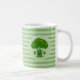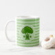 Green cartoon broccoli with a big happy smile on a green stripy background.