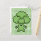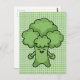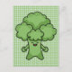 Cute green cartoon broccoli with an adorable happy face. The background is a green and white gingham pattern.